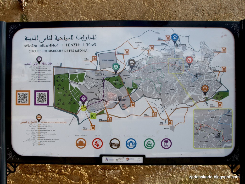 Podczas pobytu w Fezie zaleca się spacerować po medynie z przewodnikiem. Wg nas jednak spokojnie można się bez niego obejść. W mieście jest kilka dobrze oznaczonych szlaków/tras spacerowych i przemieszczając się nimi spokojnie zobaczycie to co najważniejsze. Zauważyliśmy nawet, że przewodnicy też chodzą tylko tymi szlakami. Każdy ze szlaków ma jakiś temat przewodni. Jest np. szlak fortyfikacji, szlak zabytków czy szlak rękodzieła. Przy każdym ważnym miejscu na danym szlaku postawiono tablice informacyjne w kilku językach. My skorzystaliśmy właśnie z opcji samodzielnego przemieszczania się tymi trasami. Plusem przemieszczania się po medynie z przewodnikiem jest na pewno to, że nie zaczepiają naganiacze, a niestety potrafią oni być uciążliwi, minusem to, że musicie za niego zapłacić.
