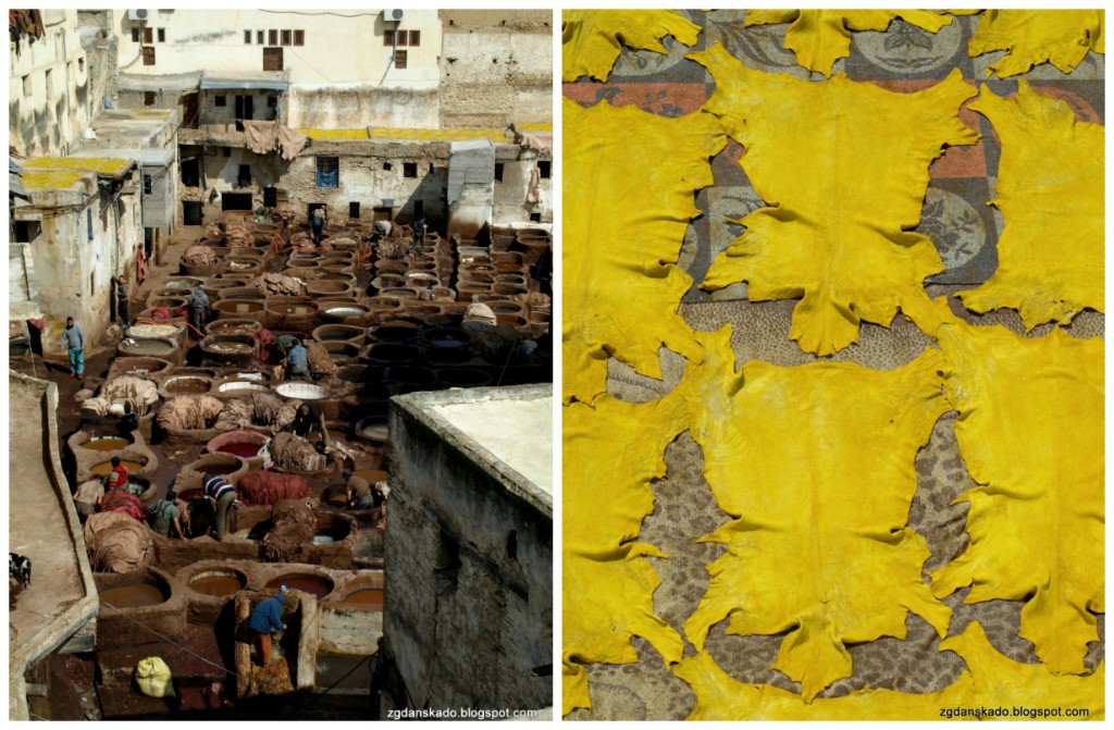 Fez nieodzownie kojarzy się z garbarniami skór i nie bez przyczyny. W mieście jest największa garbarnia w Maroku zwana Chouwara. Byliśmy, widzieliśmy, potwierdzamy. Na dzień dobry dostaliśmy kilka listków mięty, które polecono nam włożyć do nosa. Podobno latem smród jest nie do wytrzymania, a mięta ma go łagodzić. Biorąc pod uwagę fakt, że my byliśmy wczesną wiosną, mięta się nie przydała. Z tarasu mieliśmy okazję zobaczyć proces garbowania i farbowania skór. Podczas farbowania skór nie stosuje się środków chemicznych. Tylko mięta, henna, szafran i gołębie odchody, które nota bene są przyczyną smrodu w garbarniach. Wstęp: co łaska. W Fezie produkty skórzane są lekko tańsze, więc jeżeli planujecie kupić torebkę, buty czy pasek to właśnie tam.