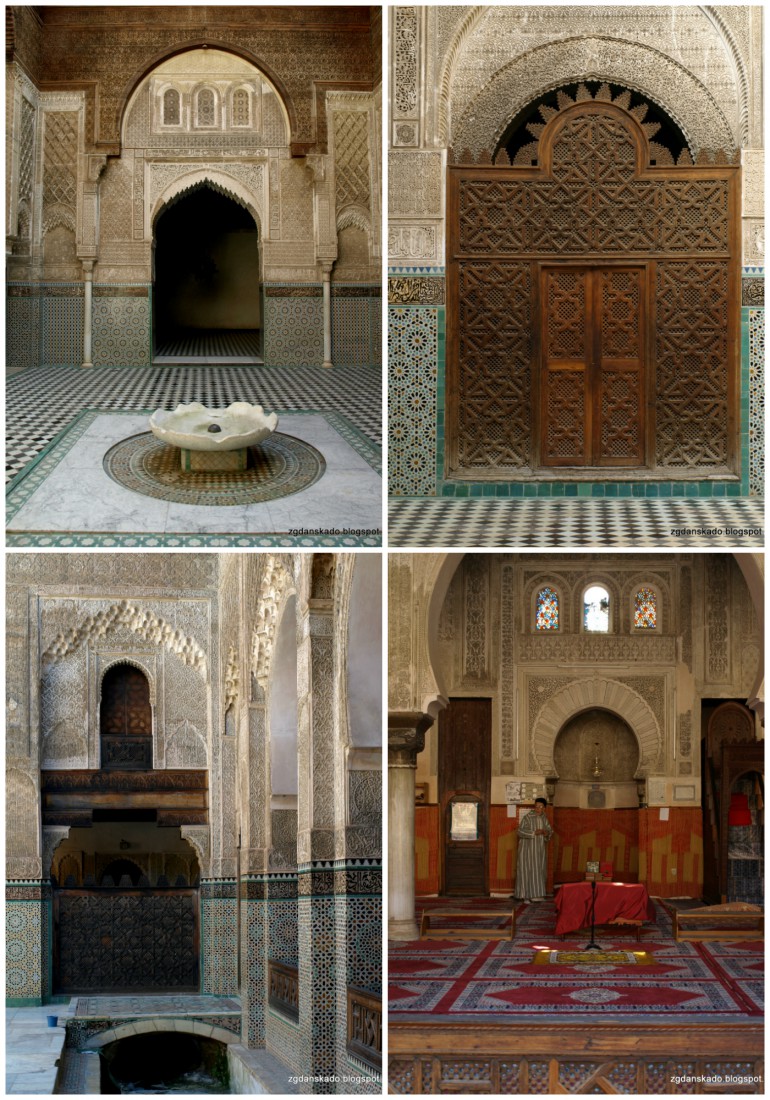 Do większości feskich zabytków niewierni nie mają niestety wstępu. Tam gdzie nie mogliśmy wejść wtykaliśmy głowy, żeby zobaczyć co kryje się w środku. Tak było w przypadku największego w mieście meczetu Al Karaouine. Na szczęście można było wejść i zwiedzać Medresy, czyli dawne szkoły koraniczne, a dziś już tylko muzea. W Fezie najpopularniejsze są dwie: Medresa Attarine i Medresa Bou Inania. Obie mają pięknie zdobione dziedzińce wewnętrzne. Podłogi wyłożone są marmurową mozaiką, a ściany i drewniane drzwi pełne są szczegółowych zdobień. Warto odwiedzić obie. W drugiej z nich w piątki nadal funkcjonuje mały meczet.