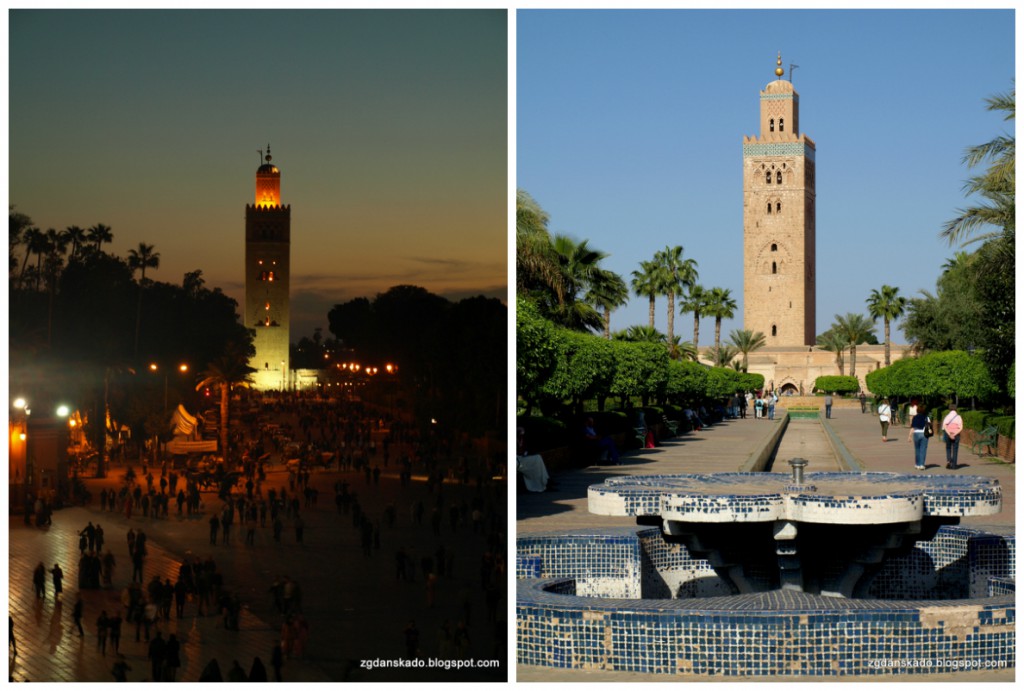 Z tarasu, oprócz widoku na plac, mieliśmy widok na minaret meczetu Koutoubia. Jego budowę ukończono już w XII wieku. Budowla jest imponująca. Równie imponujący jest otaczający go teren z pozostałościami filarów dawnego meczetu i wspaniałym ogrodem. Oczywiście do środka nie mogliśmy wejść. Jeśli zaś mowa o ogrodach to jeszcze nie raz do nich wrócimy bo jest ich kilka w Marrakeszu. W można w nich odpocząć od zgiełku miasta, zresetować się, ale o tym później.
