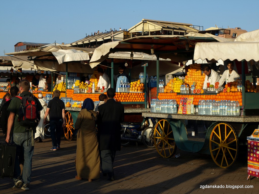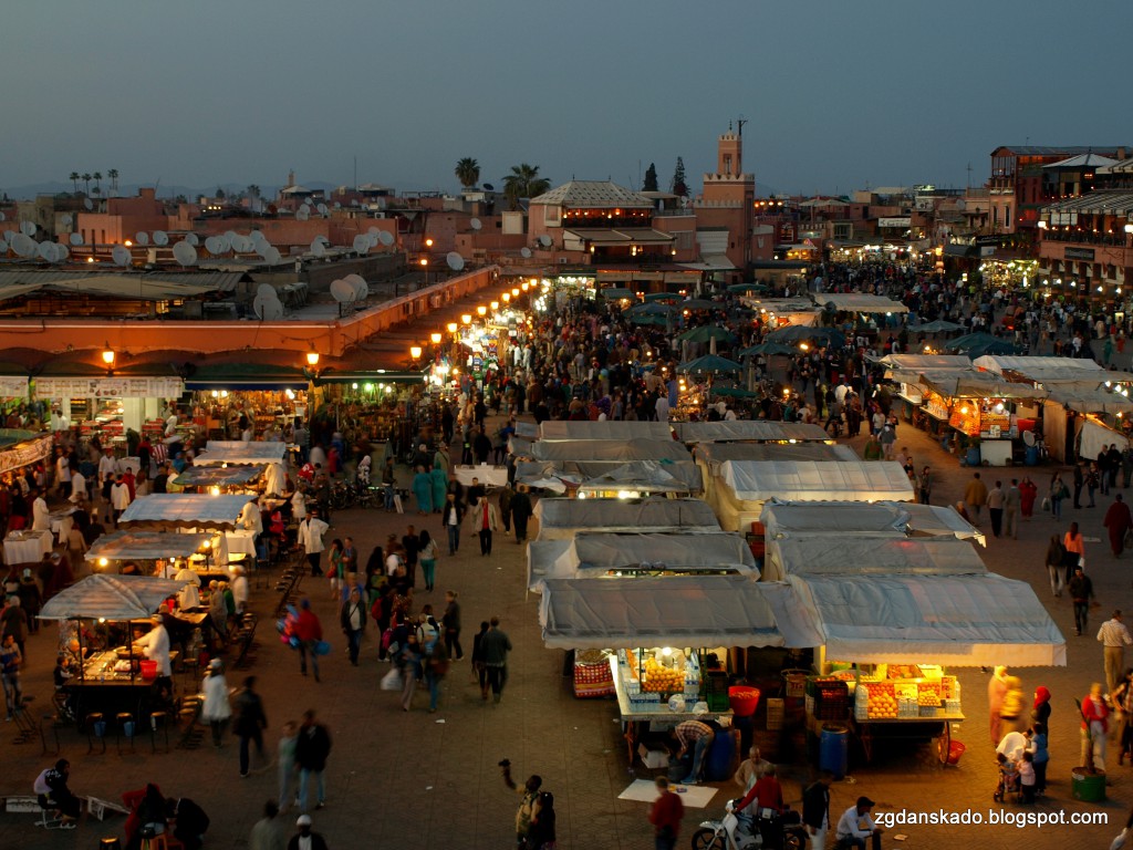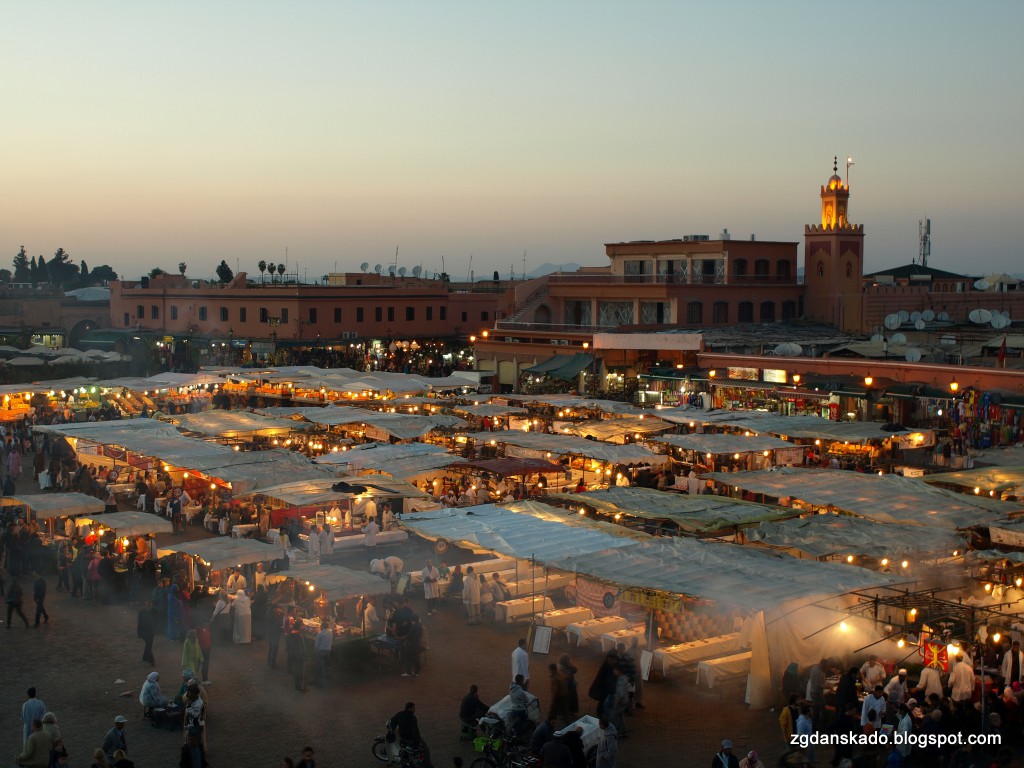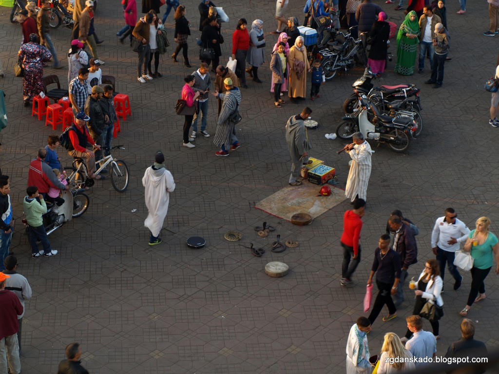 Niesamowitym przeżyciem było oglądanie budzącego się do życia o zachodzie słońca placu Jemaa el-Fna z tarasu restauracyjnego. Przyjemność ta wiązała się z kupnem napoju za 20 dh, jednak zdecydowanie polecam udać się na jeden z tarasów znajdujących się wokół placu i zająć sobie dogodne miejsce ok. godziny 17:30. Chętnych na podziwianie spektaklu z góry jest naprawdę sporo, ale nie ma co się dziwić. Gdybym jeszcze kiedyś znalazła się w Marrakeszu to na 100% zafunduję sobie taki widok ponownie. Kolejne garkuchnie rozkładały się błyskawicznie, a po chwili wszędzie unosił się dym z grilla. Gdzieniegdzie na fletach grali zaklinacze węży. Siedzieliśmy tam z półtorej godziny aż do zmroku i delektowaliśmy się niesamowitą atmosferą miejsca. Dopełnieniem tego wszystkiego było dudnienie bębnów dobiegające z każdego zakątka placu i zachodzące słońce, powodujące że plac z każdą minutą przybierał inne kolory.