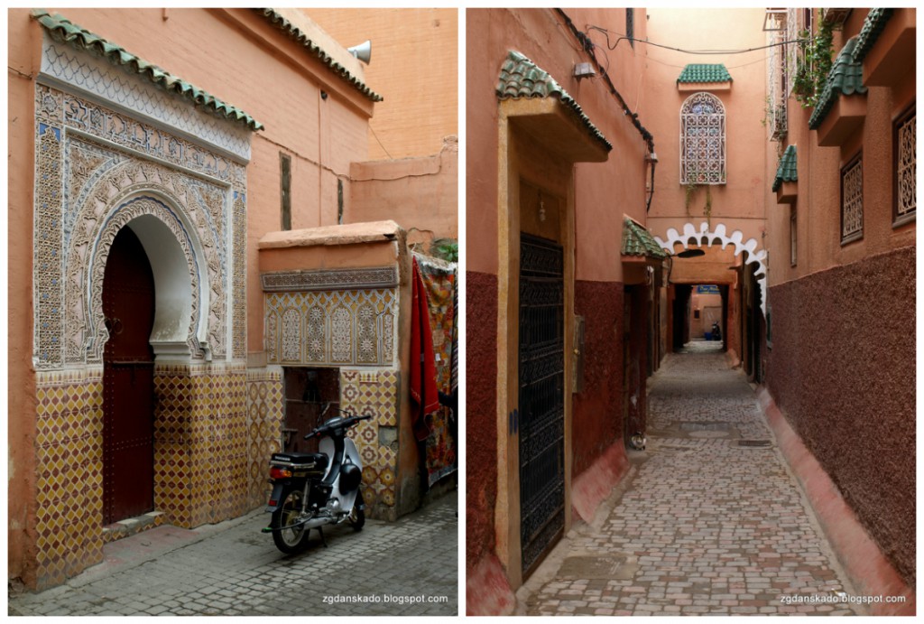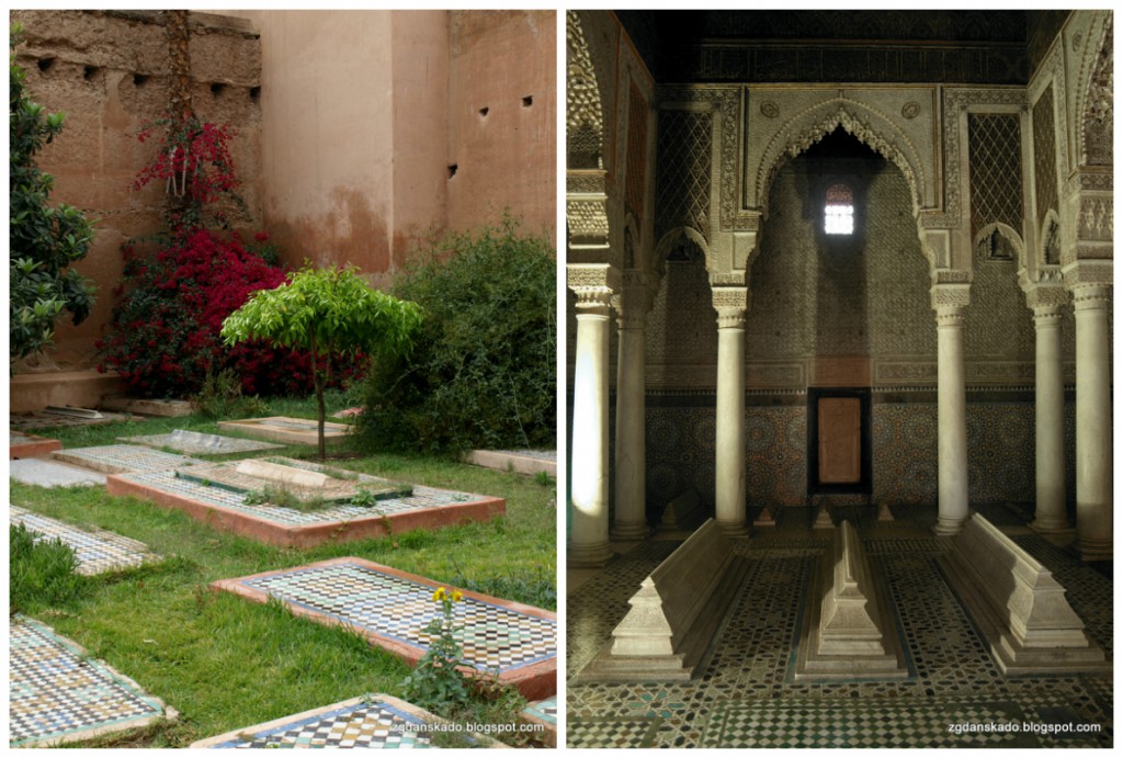 Medyna to oczywiście także zabytki. Do większości z nich niewierni nie mają wstępu, ale całe szczęście są takie miejsca gdzie za niewielką opłatą można wejść. Pierwszego dnia odwiedziliśmy mauzoleum Sadytów schowane za bramą Bab Agnaou. Obiekt składa się z kilku wspaniale zdobionych sal, w których spoczywają władcy dynastii Sadytów wraz z bliskimi. Warto zobaczyć, ale trzeba przyjść wcześnie rano. My trafiliśmy tu w czasie gdy zjechała się cała masa wycieczek, więc trochę nastaliśmy się w kolejkach do poszczególnych sal.