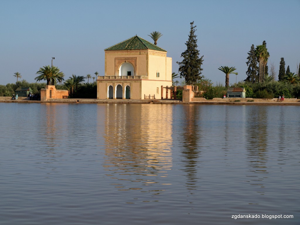 Tak jak wcześniej pisałam, do Majorelle tłumnie przybywają turyści. Gdzie więc wypoczywają miejscowi? Odpowiedź brzmi: w ogrodzie Menara. Dotarliśmy tam o najlepszej porze dnia, czyli późnym popołudniem. Za darmo można przechadzać się wśród drzewek oliwnych i słuchać muzyków, którzy być może ćwiczą przed wieczornymi występami na placu Jemaa el-Fna. Miejscem centralnym ogrodu jest kwadratowy zbiornik wodny, za którym hen hen daleko można dojrzeć ośnieżone szczyty Atlasu Wysokiego. W zbiorniku nie można się kąpać, znaleźli się jednak śmiałkowie, którzy wskoczyli do wody. Zostali z niej jednak dosyć szybko wyłowieni przez ochroniarzy. Potem byliśmy świadkami przepychanek, a właściwie bójki, pomiędzy ochroną ogrodu, a samozwańczymi pływakami. W żyłach arabskich płynie gorąca krew...