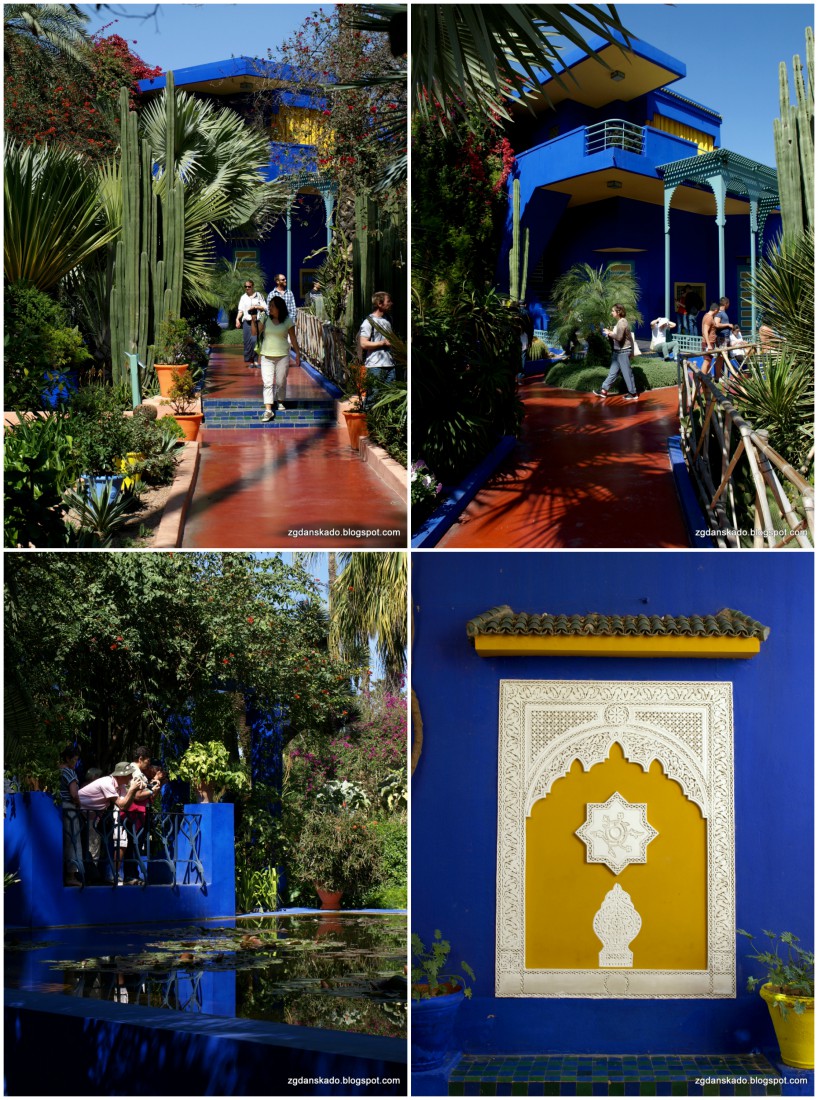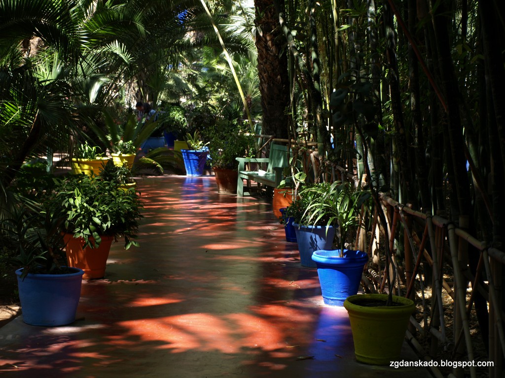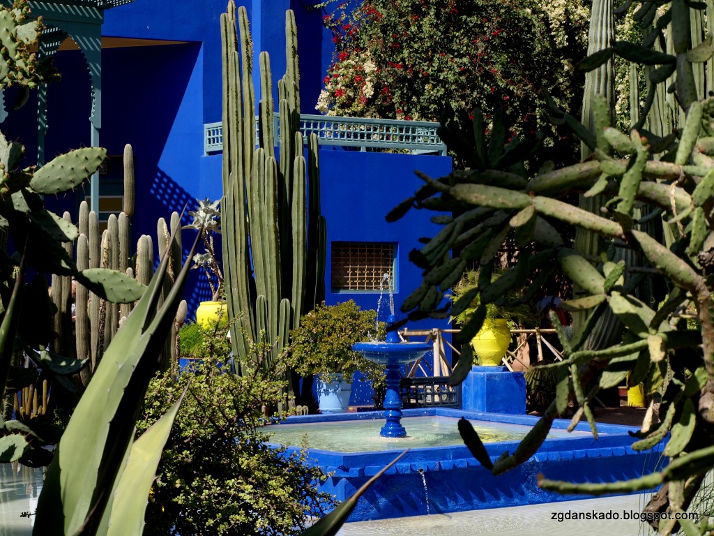 Trochę rozczarowani pierwszym kontaktem z ogrodami postanowiliśmy się nie poddawać i pójść za ciosem. Kolejnym ogrodem, do którego zawitaliśmy był słynny Jardin Majorelle. Jest to miejsce zrobione typowo pod turystów, wstęp z tego co pamiętam kosztował nas 50 dh (20 zł). Dosyć sporo jak na marokańskie warunki, biorąc pod uwagę fakt, że do tej pory płaciliśmy za wstępy do kazb czy szkół koranicznych przeważnie 10 dh (4 zł). Ogród jest malutki, ale zadbano w nim o każdy szczegół. Niektórzy mówią, że przypomina on muzułmański raj. Hmmm... może coś w tym jest chociaż tam akurat nie byliśmy. W Majorelle dominuje kolor niebieski i zielony. Nie ma tu żadnego przypadku. Każda roślina, kamyk czy ławeczka są ustawione tak, aby współgrały z resztą. Pomimo turystów można się w nim całkowicie zrelaksować. Będąc w Marrakeszu, tego miejsca po prostu nie można ominąć. Ciekawostką jest, że ostatnim właścicielem ogrodu był słynny projektant Yves Saint Laurent, a od 2010 r. zarządza nim fundacja. Do Majorelle podjechaliśmy autobusem nr 1 (rusza spod meczetu Koutoubia), a wróciliśmy do medyny już na własnych nogach.
