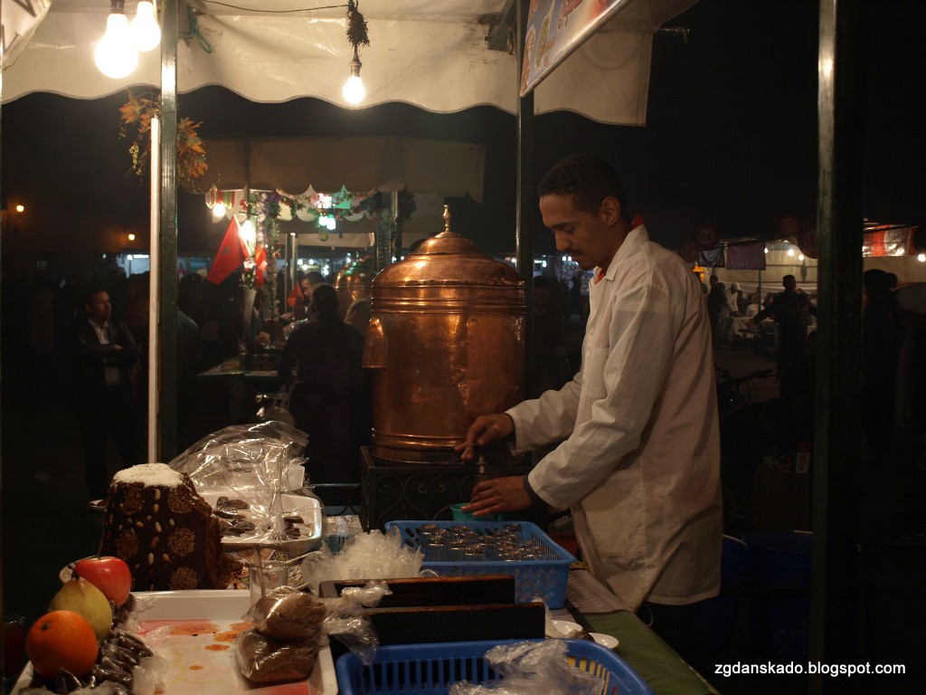 Marrakesz to przede wszystkim plac Jemaa el-Fna. Niesamowite miejsce i przysłowiowa wisienka na torcie. Za dnia nie wyróżnia się niczym specjalnym. Plac jak każdy inny plac. Ruch samochodowy, gwar i kilku sprzedawców świeżo wyciskanych soków. O zmroku przeistacza się on w zupełnie inne miejsce. Na Jemaa el-Fna wieczorową porą czułam się jak w teatrze, trwał jeden wielki spektakl. Ok. godziny 18 na placu zaczęły rozkładać się garkuchnie. Z minuty na minutę było ich coraz więcej. Nad nimi unosił się dymek, a wokół nich zapachy. Oczywiście nie omieszkaliśmy spróbować specjałów serwowanych w tych barach. Najczęściej jedliśmy u Aischy. Kelnerzy sadzali nas przy jednym z długaśnych stołów. Kurczak z frytkami, tażin czy bruschetta smakowały wyśmienicie. Ciekawym przeżyciem było też testowanie bardzo pikantnej herbaty. Konsumpcji zawsze towarzyszył wszechobecny gwar i muzyka dobiegająca z różnych zakątków placu. Dźwięk jest nieodzownym elementem spektaklu odgrywającego się placu. Grup muzycznych, grajków, śpiewaków, itp. przybywało z minuty na minutę. Wokół nich zbierały się tłumy gapiów. Czasem wszyscy razem śpiewali, a czasem tłum po prostu słuchał oczarowany. Na placu doświadczyliśmy różnych stylów muzykowania od rytmicznego bębnienia po gitarowe brzmienia. Przemieszczaliśmy się od muzyka do muzyka i wsłuchiwaliśmy wygrywane przez niego (nich) rytmy. Bardzo chcieliśmy chłonąć jak najwięcej, ale na placu dzieje się tak dużo, że nie byliśmy w stanie ogarnąć wszystkiego.