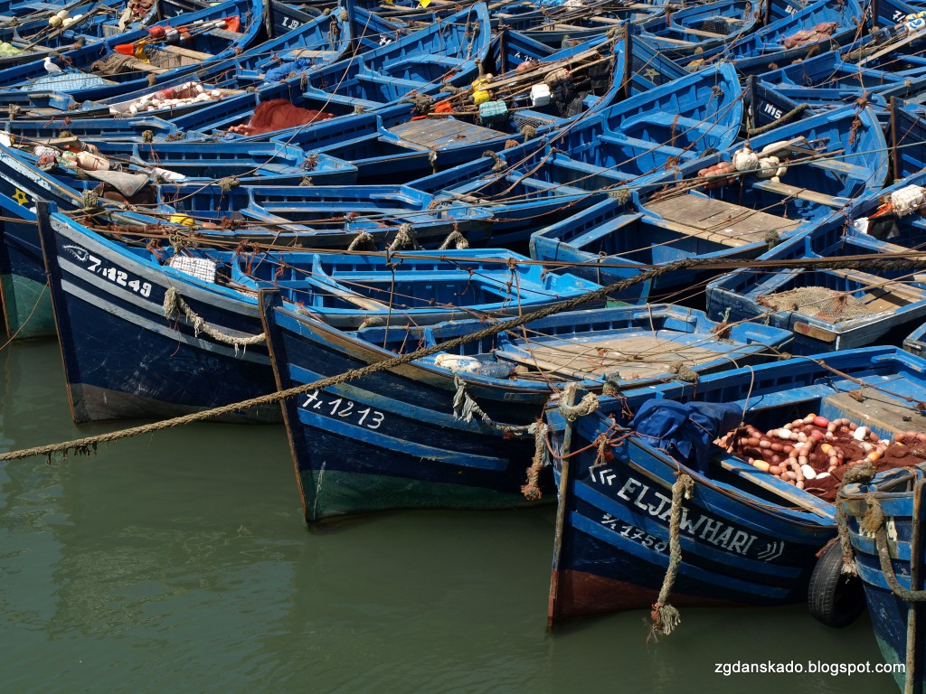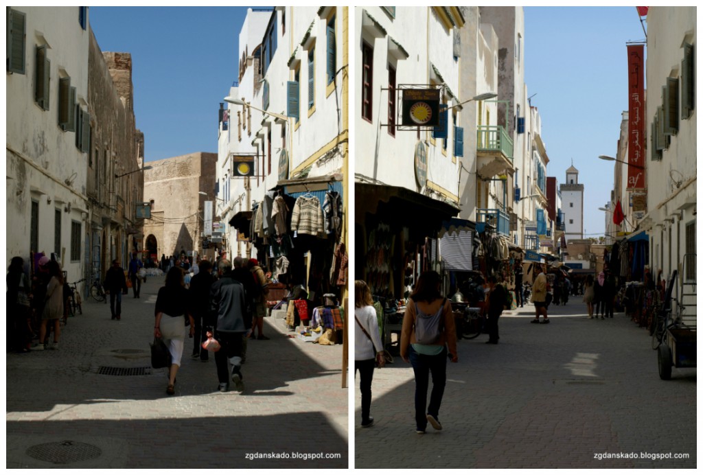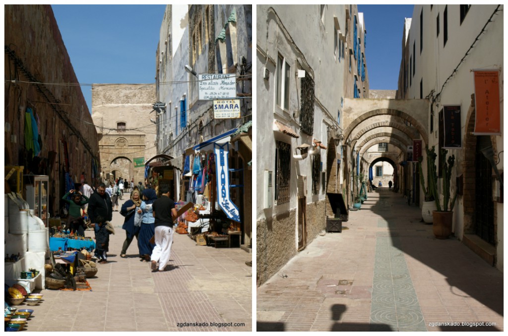 As-Sawira (Essaouira) to także medyna i suki. Jedno i drugie jest malutkie, ale urokliwe. Przyjemnie nam się po nich spacerowało. Brak pomazanych murów, brak reklam i śmieci (jednak można). Nikt nas nie zaczepiał i nie naciągał. Jedynym minusem miasta są, jak już wcześniej wspomniałam, ceny w sklepach i restauracjach. Sporo sklepów jest nastawionych na bogatego klienta, chociaż można na sukach znaleźć cosik dla mniej zamożnej klienteli. Ja np. zaopatrzyłam się w oliwki. Pycha. A jak już przy jedzeniu jestem to dodam, że oliwki oliwkami, ale kto był w As-Sawirze i nie posmakował rybki ten trąba. Mieliśmy na nią wielką ochotę. Grillowana rybeczka stała się naszym celem jeszcze zanim znaleźliśmy się w mieście. Z tym, że trochę z tropu zbiły nas ceny. Spodziewaliśmy się, że będzie tanio, a niestety nie było. Ruszyliśmy więc na poszukiwania miejsca gdzie ceny będą dla nas przystępne. Zdecydowaliśmy się na bary tuż przy porcie rybackim, jako że samemu się w nich wybierało konkretną sztukę świeżej ryby. Wybraliśmy pierwszy bar z brzegu. Ryba plus chleb i napój kosztowała nas 60 dh/os. Podano nam też jedną sałatkę na dwie osoby. Próbowałam się przy rachunku wykłócić o rabat z tego względu, ale kelner dosłownie wyrwał mi pieniądze z ręki i tyle było. Miły był tylko wtedy, gdy wybieraliśmy bar i składaliśmy zamówienie. Jedzenie było przyzwoite, ale chyba naszego dorsza czy pstrąga nie przebiło...