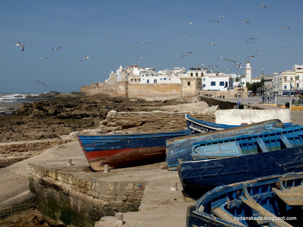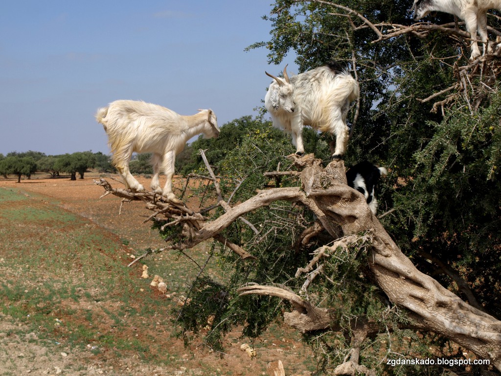 Z wielkim smutkiem opuszczaliśmy Marrakesz - miasto, do którego z pewnością jeszcze wrócimy. Naszym następnym celem była As-Sawira (Essaouira). Zdecydowaliśmy, że dostaniemy się do niej busem turystycznym. Biura turystyczne oferują jednodniowe wycieczki do wietrznego miasta, czyli o 7 rano zabierają chętnych z Marrakeszu, a wieczorem zawożą turystów z powrotem do czerwonego miasta. My w As-Sawirze postanowiliśmy zostać. Udało nam się bez problemu znaleźć biuro (zresztą bardzo blisko naszego hotelu), które przystało na naszą propozycję cenową. Z obliczeń wynikało, że zaoszczędzimy dzięki takiej opcji i czas i pieniądze. Niestety nasze kalkulacje okazały się nieprawidłowe. Myślę, że gdybyśmy skorzystali z usług CTM to bylibyśmy jakieś pół godziny szybciej, ponieważ autobus tej linii wyprzedził nas gdy zbliżaliśmy się do celu. Finansowo wyszło bardzo podobnie (doliczając ceny taksówek na dworzec autobusowy w Marrakeszu i z dworca w As-Sawirze). O godzinie 8 siedzieliśmy w busiku, który wiózł nas w stronę oceanu. Oczywiście bus turystyczny jak to bus turystyczny zrobił sobie kilka przystanków, m.in. na śniadanie, w sklepie z olejkami arganowymi oraz przy drzewie (arganii żelaznej), na którym koczowały kozy. Tak, kozy! Wskakują one na gałęzie arganii i zaczynają ucztowanie. Obrazek jest niesamowity. Jak widać w Maroku wszystko jest możliwe... nawet bella koza na drzewie. Właśnie te postoje sprawiły, że przyjechaliśmy później niż zakładał nasz pierwotny plan, ale przynajmniej zobaczyliśmy kozy, więc nie było tak źle. W miasteczku byliśmy po jakiś 3,5 godzinach jazdy.