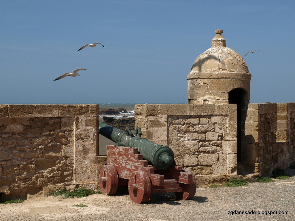 Nieopodal fortu znajduje się południowy bastion As-Sawiry. Zresztą na marginesie dodam, że w As-Sawirze wszystko jest "nieopodal", bo stare miasto jest niewielkie. Co prawda za wstęp na teren bastionu musieliśmy zapłacić 10 dh, ale nie żałujemy absolutnie. Mieliśmy z niego genialny widok na otoczoną murami medynę i port rybacki. Będę się powtarzać, ale muszę znowu napisać, że wiało. Momentami podmuchy wiatru były tak mocne, że musiałam szukać schronienia przy murach.