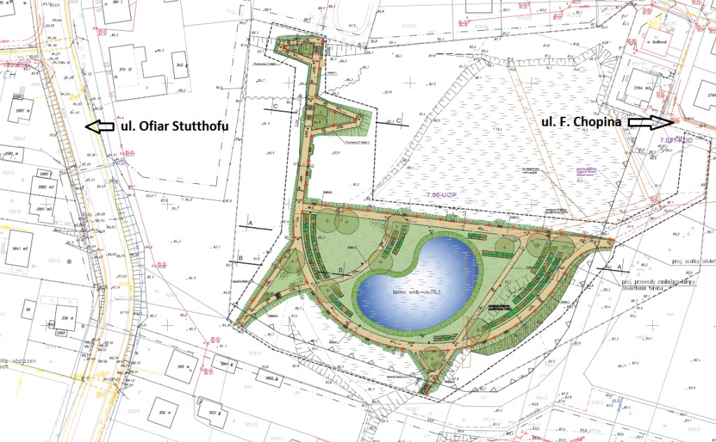 Aktualnie przebiegają prace ziemne, polegające na wymianie torfu, przygotowaniu gruntu pod budowę oświetlenia, parkingu, drogi, stawu oraz alejek parkowych.