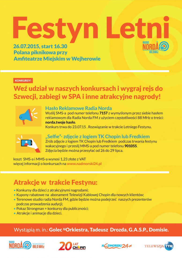 Golec uOrkiestra, Tadeusz Drozda, mnóstwo konkursów z super nagrodami, pokaz strongman, atrakcje dla dzieci i wiele innych niespodzianek – to wszystko czeka na Was podczas Festynu Letniego z okazji startu radia Norda FM w eterze! Festyn będzie transmitowany na żywo w Twojej Telewizji Morskiej oraz na portalu Nadmorski24.pl. Oprócz tego relację z wydarzenia będzie można usłyszeć, również na żywo, w radiu Norda FM!