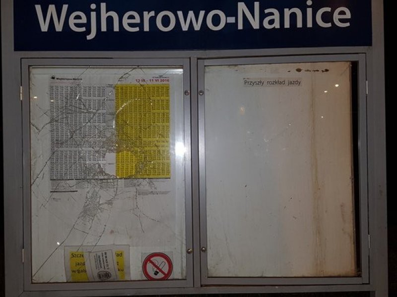 Na peronie SKM w Wejherowie Nanicach trzech mężczyzn urządziło sobie zakrapianą alkoholem imprezę, podczas której najprawdopodobniej jeden z nich zniszczył gabloty z rozkładem jazdy. W związku ze zdarzeniem interweniował patrol straży miejskiej. Do incydentu doszło we wtorek (10 maja) około godziny 22:30.