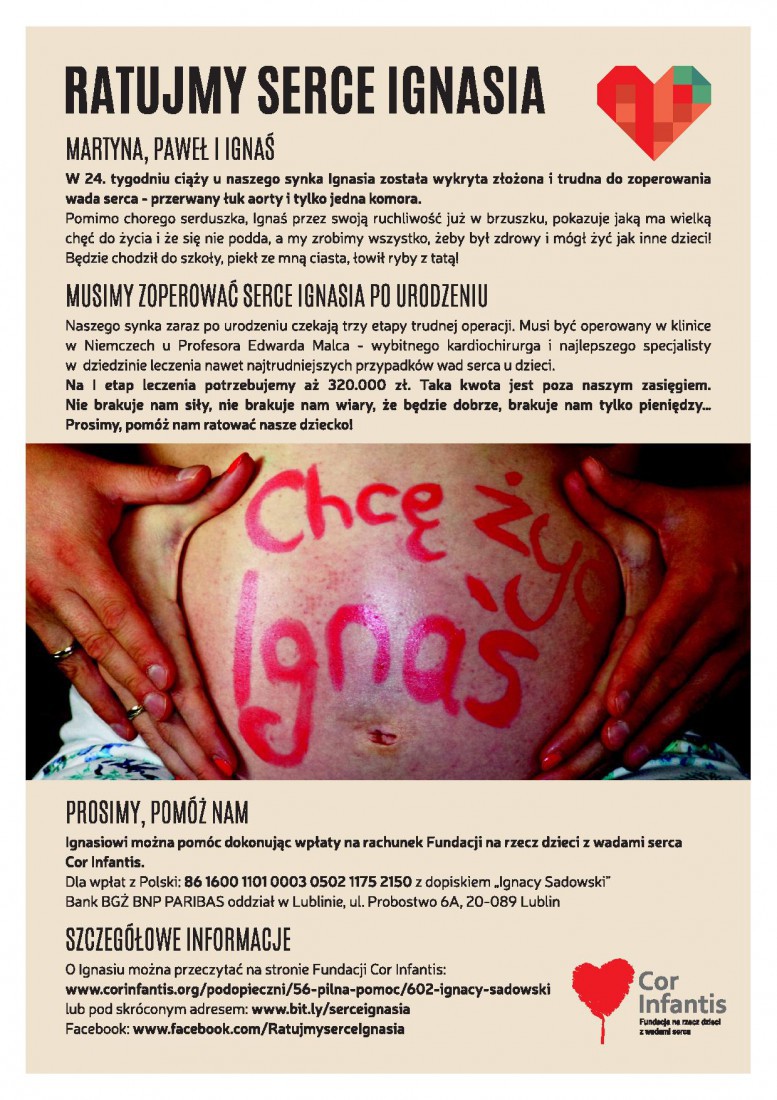 Ignaś przyjdzie na świat z wrodzoną wadą serca pod postacią zespołu niedorozwoju serca prawego, przełożenia wielkich pni tętniczych i przerwanego łuku aorty. Jego mama 26 września ma zostać przyjęta do Kliniki Uniwersyteckiej, w Munster, w Niemczech, a obecnie prosi o pomoc w ratowaniu życia nienarodzonego syna.