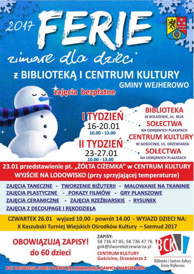 Podczas tegorocznych warsztatów zimowych uczestnicy będą mogli poznać tajniki tworzenia autoportretu, mozaiki, audiobooka, rekwizytów cyrkowych i czekolady. W ofercie Wejherowskiego Centrum Kultury nie zabranie również zajęć tanecznych, cyrkowych, teatralnych, muzycznych i plastycznych.