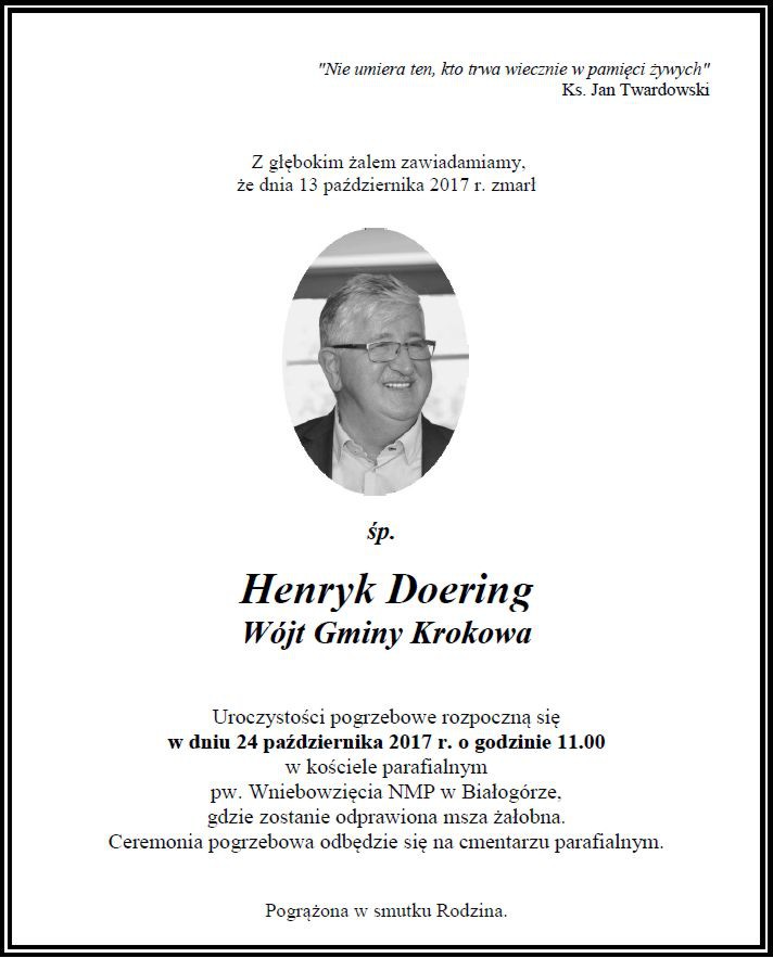 To kolejna smutna informacja tego dnia. W piątek (13 października) niespodziewanie zmarł Henryk Doering, wójt gminy Krokowa. Wiadomo, że samorządowiec w dniu śmierci wypoczywał na Cyprze, najprawdopodobniej utonął. Miał 60 lat.