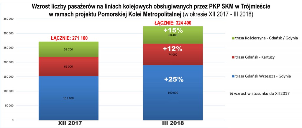 – Kilkunastoprocentowe wzrosty na regionalnym odcinku PKM w stosunku do poprzedniego kwartału obserwujemy regularnie od grudnia 2016 r., kiedy wprowadziliśmy rewolucyjną dla pasażerów zmianę polegającą na skierowaniu większości pociągów z Kościerzyny do Gdyni nową trasą przez Gdańsk Wrzeszcz – dodaje Ryszard Świlski, członek Zarządu Województwa Pomorskiego odpowiedzialny za transport.