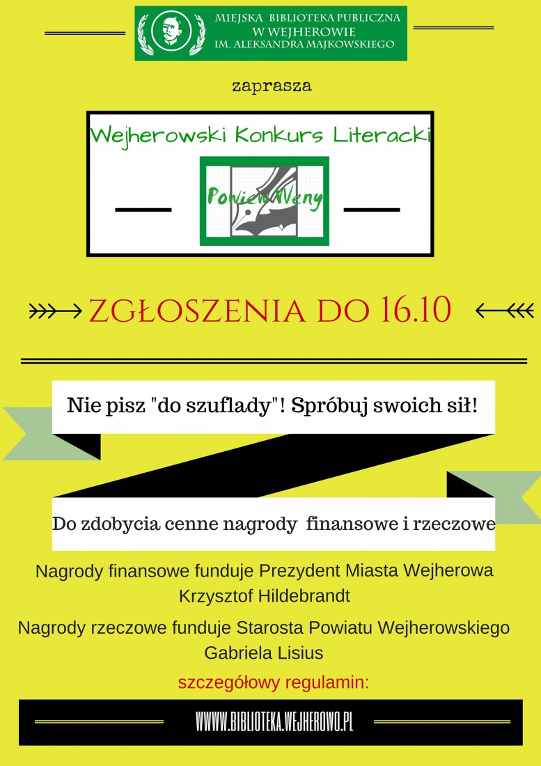Przed nami X edycja Wejherowskiego Konkursu Literackiego "Powiew Weny". Z okazji jubileuszu konkursu, Miejska Biblioteka Publiczna w Wejherowie przygotowała dodatkowe formy aktywności dla uczestników. Pierwszą z nich było pisanie wspólnego opowiadania przez laureatów poprzednich edycji konkursu. Temat tegorocznego konkursu brzmi: "Niech ten jubileusz milowym będzie kamieniem...".