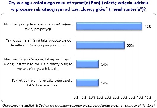 Informacje o dotychczasowych doświadczeniach z tzw. „łowcami głów” zebrano wśród czytelników portalu rynekpracy.pl. Jak wynika z sondy przeprowadzonej przez nasz portal, aż 44% respondentów przyznaje, iż co najmniej raz w ciągu ostatniego roku otrzymało propozycję od headhuntera. Z taką sytuacją nigdy nie spotkało się 41% ankietowanych, zaś 14% nie otrzymało takiej propozycji w ostatnim roku, ale zdarzyło się to w poprzednich latach.