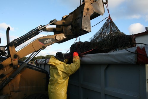 Szkielet wieloryba został zabrany za pomocą specjalnie przystosowanego samochodu ciężarowego.