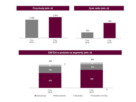 Segment Dystrybucji - kluczowy dla Grupy segment w I kwartale poprawił wynik EBITDA o 22 proc., osiągajac poziom 498 mln zł. To efekt wyższego o 4 proc. wolumenu dostarczonej energii, jak i wyższej średniej stawki sprzedaży usług dystrybucyjnych. Dodatkowo, do zwiększenia zysków przyczynił się spadek strat sieciowych. To głównie efekt przejścia z sześciomiesięcznych odczytów na dwumiesięczne. Taki system pozwolił zwiększyć jednorazowo przychody z usług dystrybucyjnych.