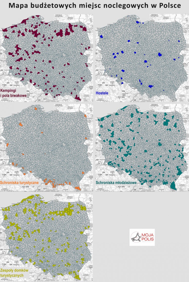 Jak wynika z badań, niedrogie noclegi najłatwiej znaleźć nad morzem, na Mazurach oraz w górach. Kempingi i pola biwakowe najgęściej są rozsiane wzdłuż wybrzeża Bałtyku. W samym Mielnie działa 12 obiektów tego rodzaju, we Władysławowie 10, w Łebie 7. W 2014 roku na kempingach i polach biwakowych nocowało 280 tys. turystów, a ponad 25 procent z nich przyjechało z zagranicy.