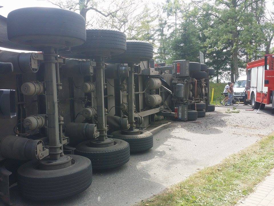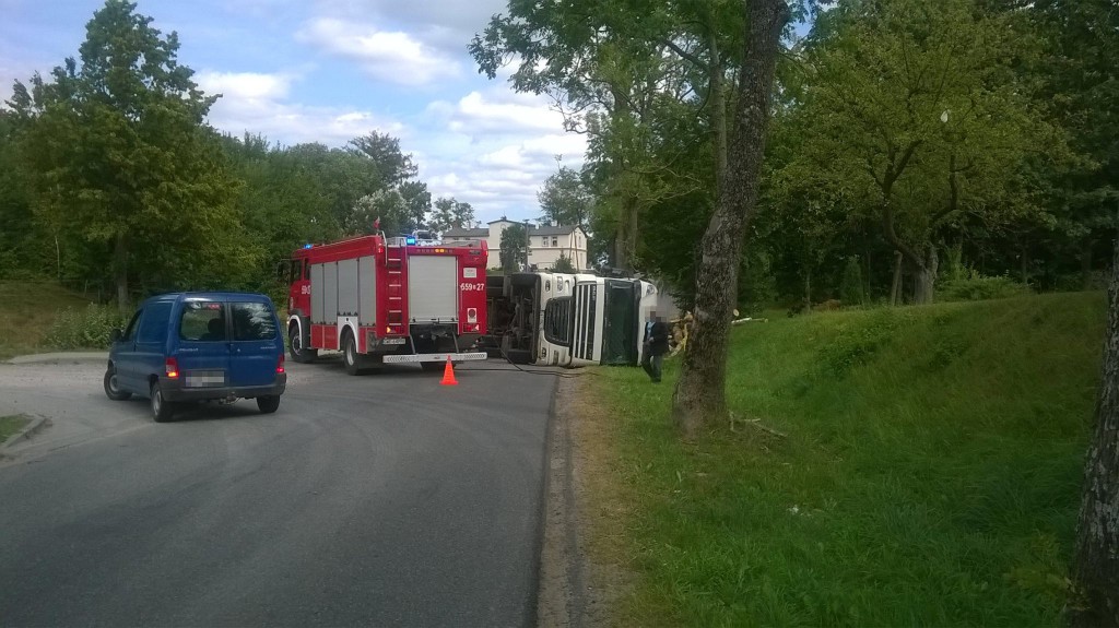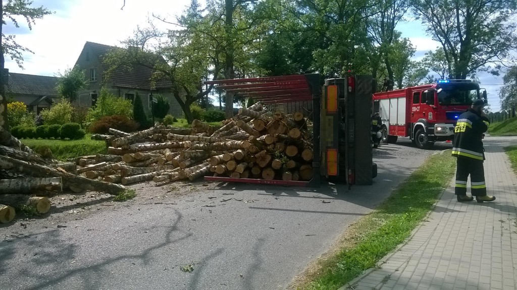 Około godziny 12:00 na skrzyżowaniu ulic Ludowej i Wspólnej w Kochanowie przewróciła się ciężarówka przewożąca drewno.
