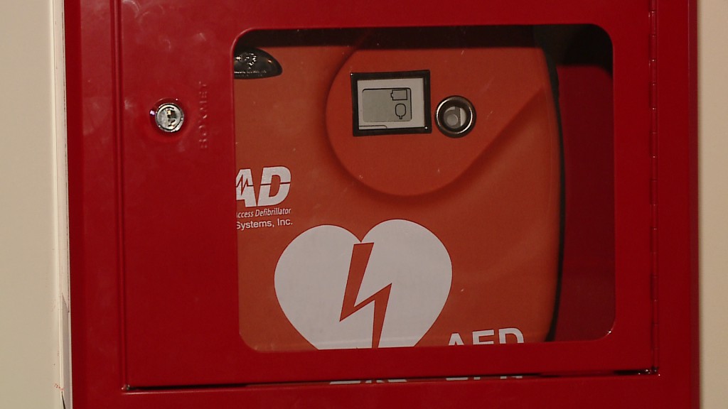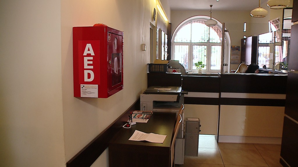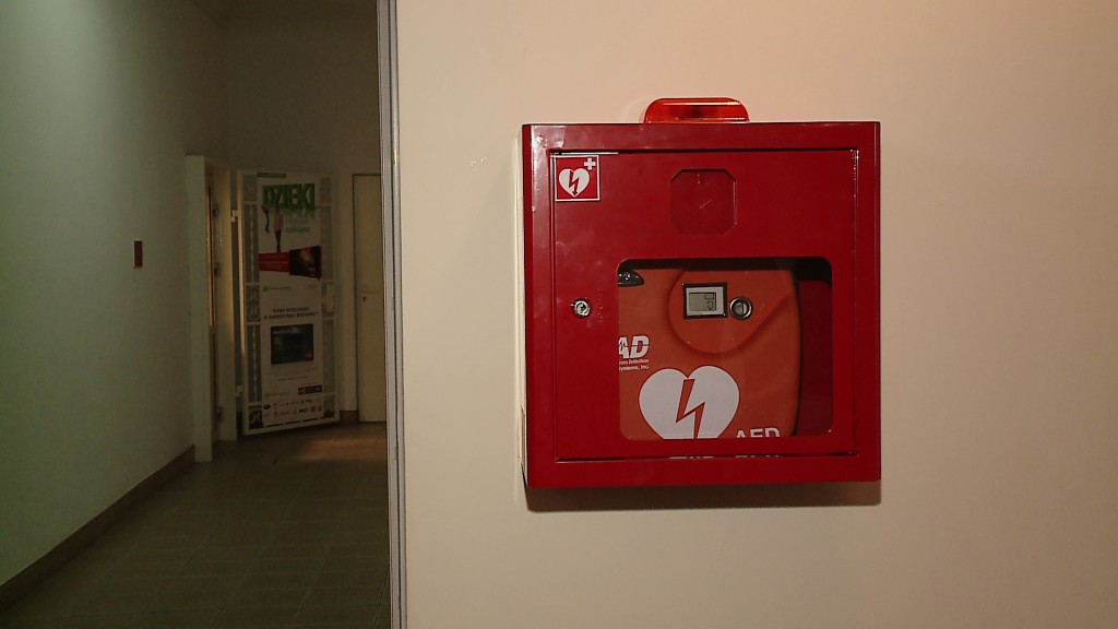 Defibrylator znajduje się w specjalnej skrzynce, klucz do niej można pobrać w biurze obsługi interesanta.