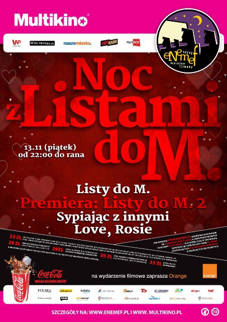 ENEMEF: NOC Z LISTAMI DO M. odbędzie się 13 listopada (piątek) jednocześnie w 29 kinach sieci Multikino w Polsce: Bydgoszcz, Czechowice-Dziedzice, Elbląg, Gdańsk, Gdynia, Katowice, Kielce, Koszalin, Kraków, Lublin, Łódź, Olsztyn, Poznań 51, Poznań Malta, Radom, Rumia, Rybnik, Rzeszów, Słupsk, Szczecin, Tychy, Warszawa Targówek, Warszawa Wola, Warszawa Złote Tarasy, Warszawa Ursynów, Włocławek, Wrocław Arkady Wrocławskie, Wrocław Pasaż Grunwaldzki, Zabrze.