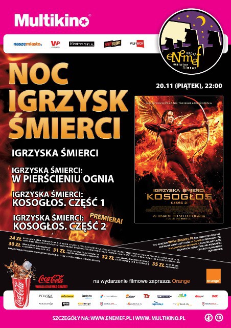 ENEMEF: NOC IGRZYSK ŚMIERCI odbędzie się 20 listopada (piątek) jednocześnie w 32 kinach sieci Multikino w Polsce: Bydgoszcz, Czechowice-Dziedzice, Elbląg, Gdańsk, Gdynia, Katowice, Kielce, Koszalin, Kraków, Lublin, Łódź, Olsztyn, Poznań 51, Poznań Malta, Poznań Stary Browar, Radom, Rumia, Rybnik, Rzeszów, Słupsk, Sopot, Szczecin, Tychy, Warszawa Targówek, Warszawa Wola, Warszawa Złote Tarasy, Warszawa Ursynów, Włocławek, Wrocław Arkady Wrocławskie, Wrocław Pasaż Grunwaldzki, Zabrze, Zgorzelec.
