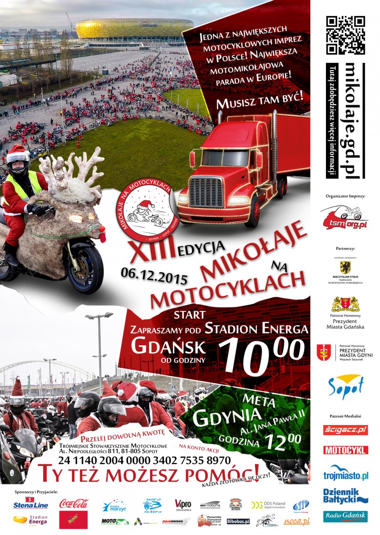 Już po raz trzynasty, rusza Wielka Parada Mikołajów na Motocyklach 2015. Tegoroczna edycja odbędzie się w niedzielę, 6 grudnia, w Mikołajki. Dochód z akcji zostanie przeznaczony na dofinansowanie posiłków dla dzieci z pomorskich ośrodków szkolno-wychowawczych.