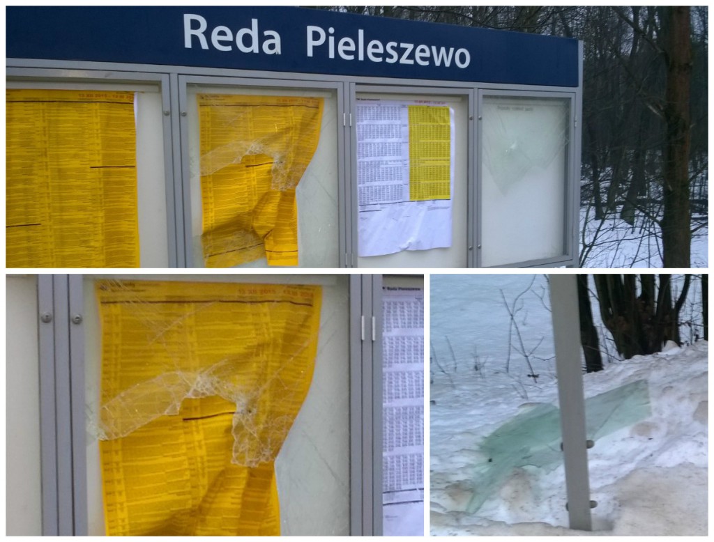 Potłuczone szyby, zdewastowane tablice informacyjne, taki widok można zastać na przystanku SKM w Redzie Pieleszewo - jeden z naszych czytelników podzielił się nim z nami i przesłał zdjęcia.