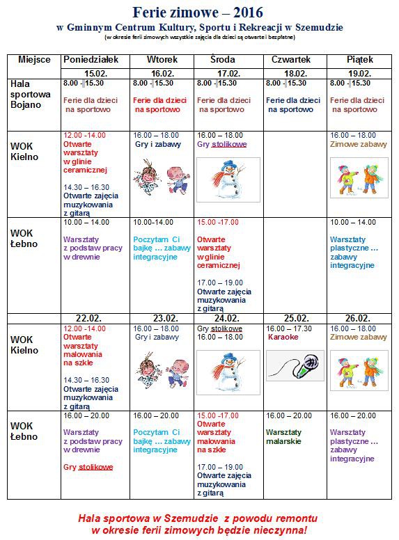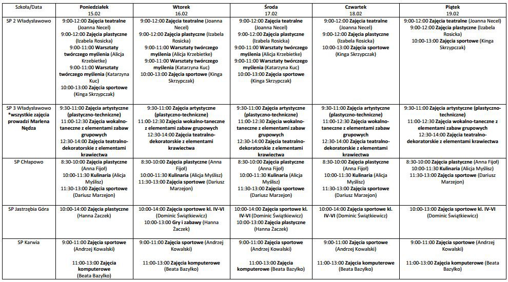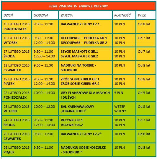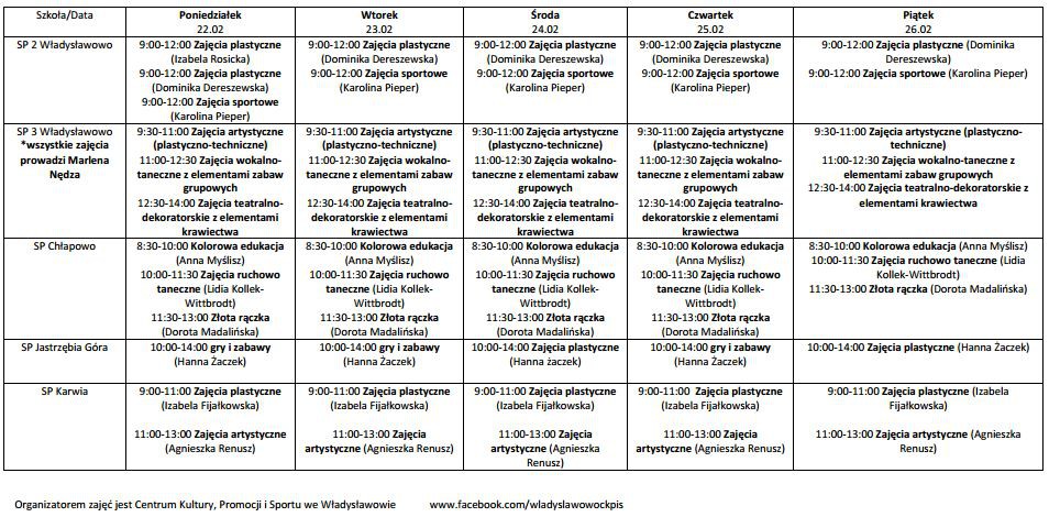 – zajęcia muzyczne: 15-19.02.2016, w godz.11:00 – 12:30 – zajęcia teatralne: 22-26.02.2016, w godz.11:00 – 12:30 – zajęcia plastyczne: 15-26.02.2016, w godz. 10:00 – 12:00