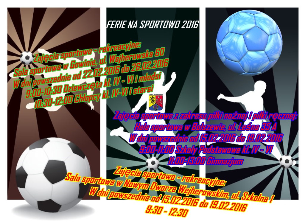 Prezydent Miasta Wejherowa oraz Wejherowskie Centrum Kultury zapraszają dzieci i młodzież szkół podstawowych i gimnazjalnych na „Akcję Zima 2016 ”. Zajęcia sportowe będą odbywały się od poniedziałku do piątku 15 – 19.02 oraz 22 – 26.02.2016 w halach sportowych Szkół Podstawowych nr 6, 8 i 11 w Wejherowie. Organizatorzy przygotowali szereg rozgrywek dla dziewcząt i chłopców z różnych roczników w takich dyscyplinach, jak piłka nożna, piłka siatkowa czy koszykówka. Dzieci i młodzież będą mogły korzystać z promocyjnych cen na krytej pływalni.