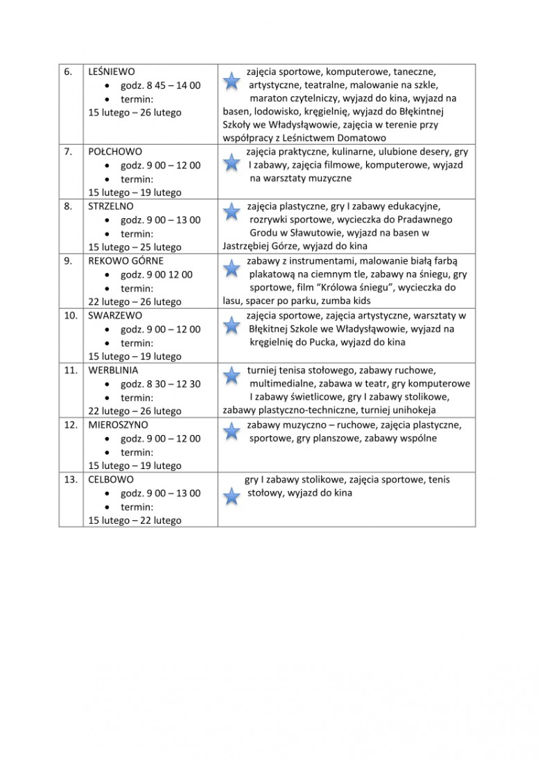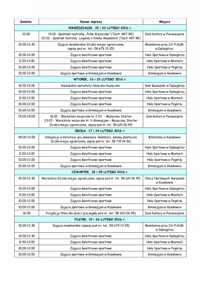 W programie m.in. – zajęcia sportowe na hali gimnastycznej, – warsztaty plastyczne, – warsztaty taneczne, – dzień Bajki Kaszubskiej, – wyjazd do kina