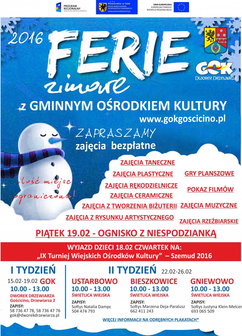 Jak co roku podczas ferii zimowych, które w woj. pomorskim będą odbywały się od 15 do 26 lutego, nie zabraknie atrakcji dla naszych młodych mieszkańców. Pociechy spodziewać się mogą bezpłatnych projekcji filmowych, przedstawień teatralnych i warsztatów odbywających się w Gminnym Domu Kultury w Pierwoszynie. Tradycyjnie każda ze szkół gminnych przygotuje ofertę zajęć świetlicowo-sportowych. W tym roku poza prowadzonymi przez Bibliotekę oraz ZKP o. Dębogórze-Kosakowo warsztatami odbędą się również warsztaty prowadzone przez Kaszubski Regionalny Chór Morzanie.