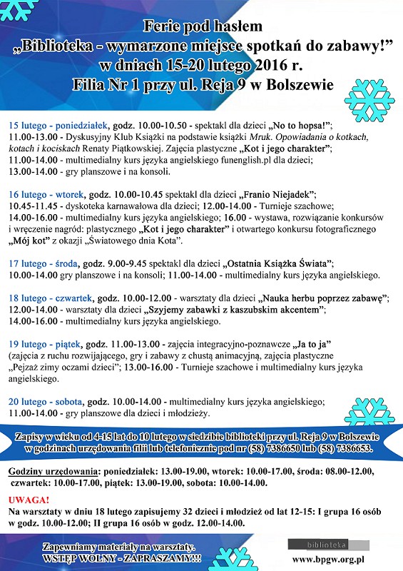 Wejherowskie Centrum Kultury, Szkolny Związek Sportowy, biblioteka miejska oraz placówki oświatowe przygotowały na czas ferii zimowych szereg atrakcji dla młodych wejherowian.