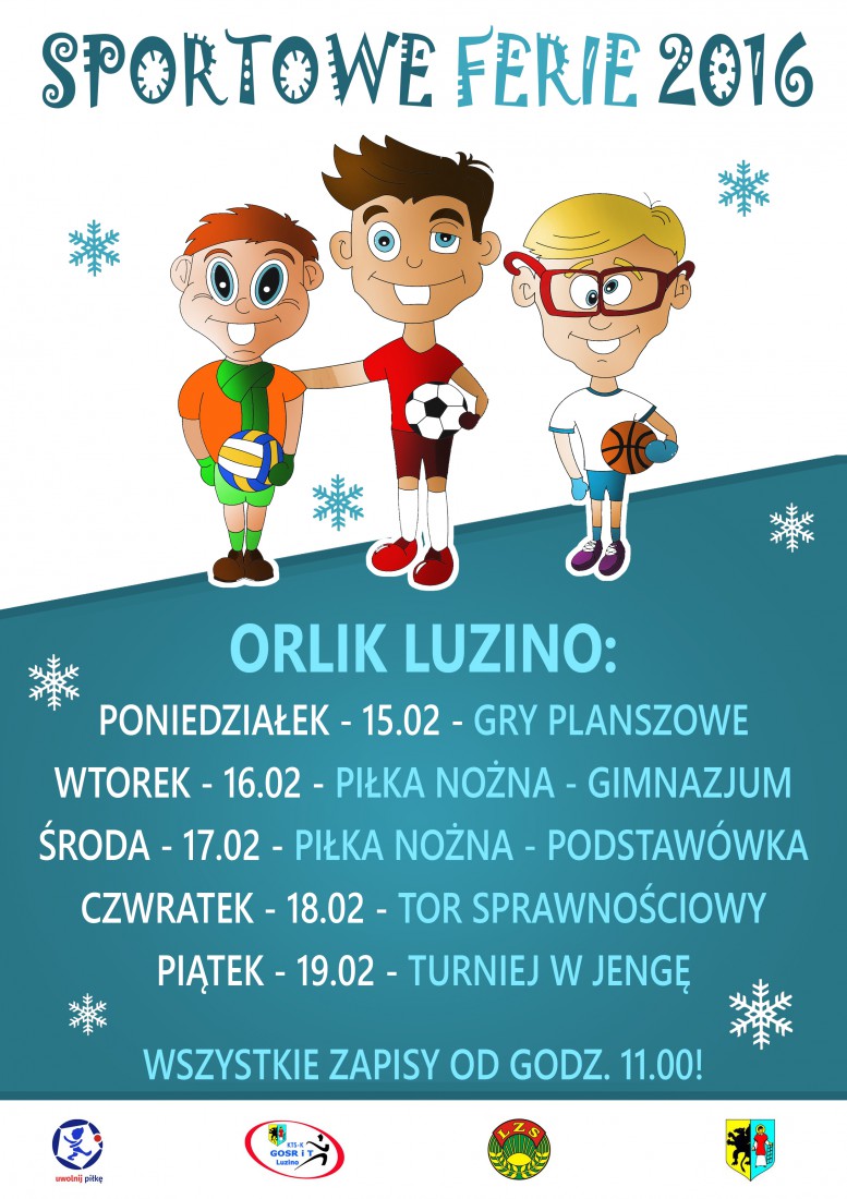 Zbliżają się ferie zimowe. Zapraszamy do sportowej aktywności na luzińskim Orliku, który będzie czynny codziennie od 10:00-20:00, gdzie pod okiem animatora sportu będzie można uczrstniczyć w różnorakich aktywnościach.