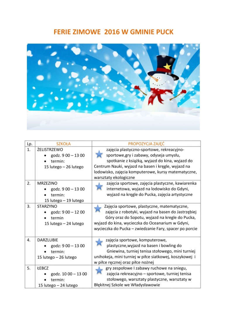 W tym roku organizujemy uroczystą inaugurację akcji „Ferie w Pucku” w dniu 15 lutego 2016 r. o godz. 8.00 w hali sportowej MOKSiR (ul.Lipowa 3c).
