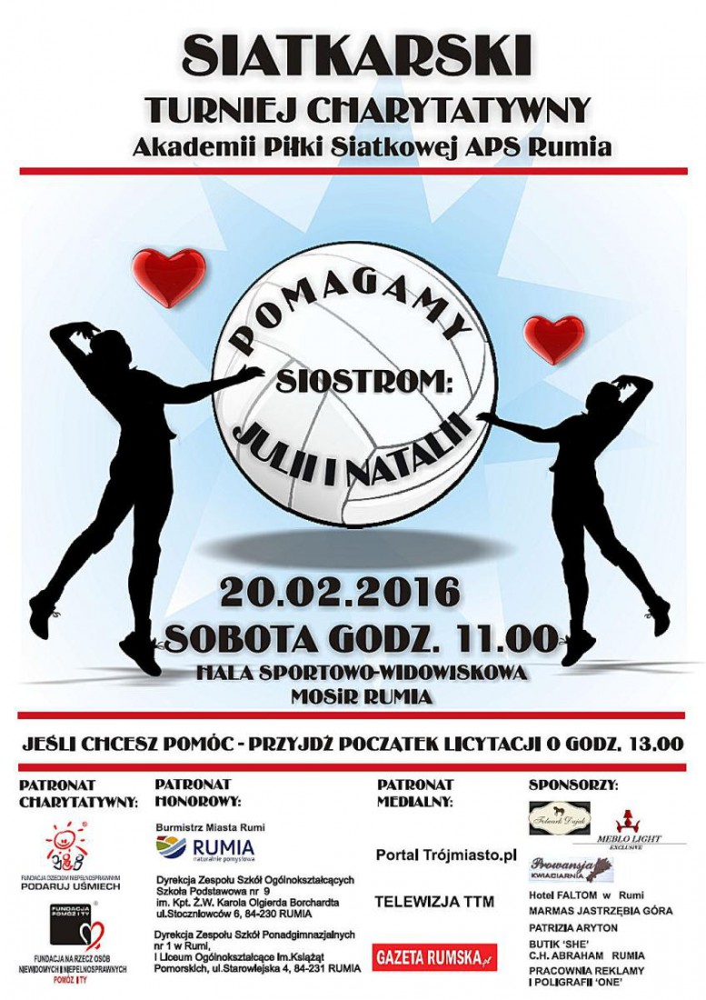 Siatkarski Turniej Charytatywny APS Rumia odbędzie się pod hasłem „Pomagamy siostrom - Julii i Natalii”. Rozpocznie się w sobotę, 20. lutego o godz.11.00, na hali rumskiego MOSiR-u. Patronat honorowy nad wydarzeniem objął burmistrz Rumi.