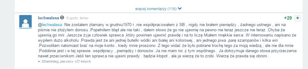 - Popełniłem błąd ale nie taki, dałem słowo że go nie ujawnię na pewno nie teraz jeszcze nie teraz. Chyba że ujawnią go inni. Jeszcze żyje człowiek sprawca, który powinien ujawnić prawdę i na to liczę. Miałem miękkie serce. W internowaniu napisano że wypiłem dużo alkoholu. Prawda jest że ani jednej butelki wódki ani białej ani kolorowej, ani jednego piwa, parę szampanów i kilka win. Pozwoliłem natomiast brać na moje konto, kiedy mnie proszono. Z tego widać że było pobrane trochę tego za moją wiedzą, ale nie dla mnie. Podobnie jest i w tej sprawie, współpracy, pieniędzy i donosów. Ja nie mam nic z tym wspólnego. Ja dotrzymuje danego słowa przyrzeczenia nawet przeciwnikom Jeśli ten sprawca nie ujawni prawdy będzie kłopot, ale ja wierzę że to zrobi. Wierzę że prawda się obroni – czytamy na mikroblogu Lecha Wałęsy na stronie wykop.pl.