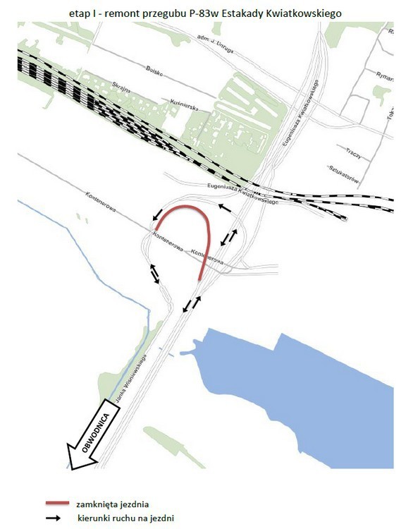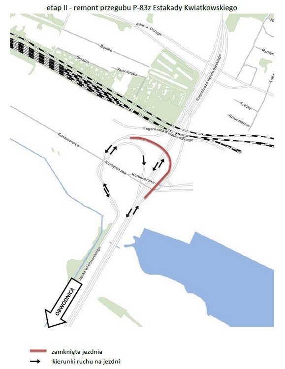 Z kolei rozpoczęcie II etapu planowane jest na 21.05.2016 i zakończy się przed Festiwalem Open'er. Remontowany będzie przegub na łącznicy zjazdowej z Estakady Kwiatkowskiego (z kierunku Obwodnicy Trójmiasta) na ul. Kontenerową. Zjazd z Estakady na ul. Kontenerową możliwy będzie łącznicą przy ul. Janka Wiśniewskiego.