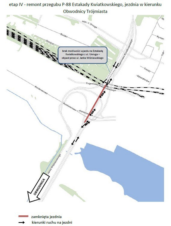 IV etap - naprawa przegubu zlokalizowanego na jezdni głównej w kierunku Obwodnicy, wykonawca planuje rozpocząć 01.09.2016. W tej fazie zamknięty zostanie odcinek jezdni w kierunku Obwodnicy Trójmiasta na wysokości ul. Kontenerowej. Ruch będzie odbywał się jezdnią w kierunku Obłuża dwukierunkowo.