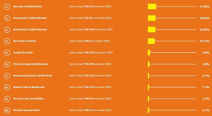 Po drugim tygodniu głosowania w plebiscycie na Najlepszą Restaurację w powiecie wejherowskim prowadzi Karczma Zochlina w Rumi (17.42%). Na drugiej pozycji plasuje się Restauracja 3 Ryby Bolszewo (16.52%). Na trzecim miejscu znajduje się Restauracja u Bąbli w Bolszewie (15.92%). Zobacz pierwszą dziesiątkę: