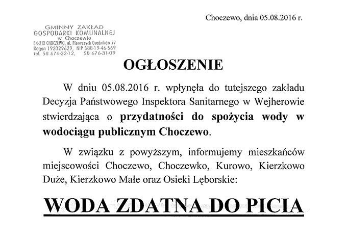 Inspektor sanitarny w Wejherowie stwierdził przydatność do spożycia wody pochodzącej z wodociągu Choczewo. Tym samym mieszkańcy miejscowości: Choczewo, Choczewko, Kurowo, Kierzkowo Duże, Kirzekowo Małe oraz Osieki Lęborskie mogą ponownie używać bieżącej wody w celach spożywczych.