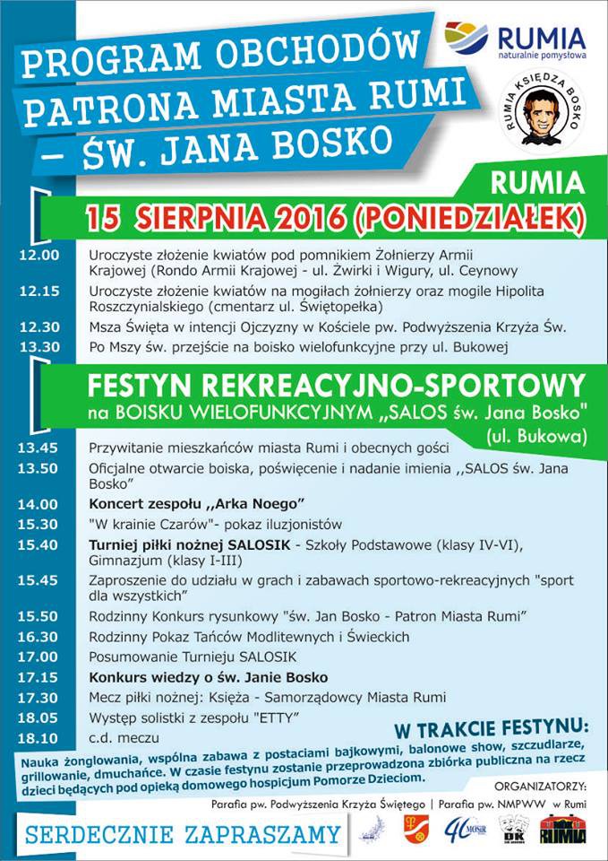 W najbliższy poniedziałek (15 sierpnia) Rumia będzie obchodzić dzień swojego patrona - św. Jana Bosko. Obchody rozpoczną się uroczystym złożeniem kwiatów pod pomnikiem Żołnierzy Armii Krajowej, a także przy mogiłach żołnierzy i mogile Hipolita Roszczynialskiego na cmentarzu przy ul. Świętopełka. Następnie, w Kościele pw. Podwyższenia Krzyża Świętego, odbędzie się msza św. w intencji Ojczyzny.