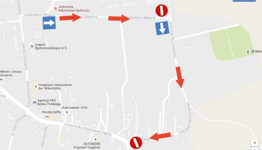 W dniach 30.10-1.11.2016 r. na ul. Miegonia oraz ul. Muchowskiego zostanie wprowadzony jeden kierunek ruchu od ul. Dickmana do ul. Arciszewskich.