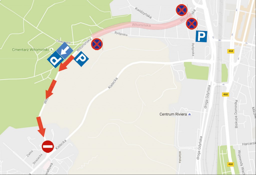 Od 29 października do 1.11.2016r na odcinku ul. Witomińskiej od ul Warszawskiej do cmentarza obowiązywać będzie obustronny zakaz zatrzymywania się. W dniach 31.10 i 1.11. od godziny 6:00 na ulicy Witomińskiej od bramy cmentarza do ul. Rolniczej wprowadzony zostanie jeden kierunek ruchu. Po lewej stronie wyżej wymienionego odcinka ul. Witomińskiej obowiązywać będzie zakaz zatrzymywania się. Natomiast po prawej stronie można będzie parkować pojazdy. Na odcinku od bramy cmentarza do wjazdu z parkingu zlokalizowanego po lewej stronie ulicy Witomińskiej będzie możliwość wyłącznie zatrzymania pojazdu w celu wysadzenia pasażera.