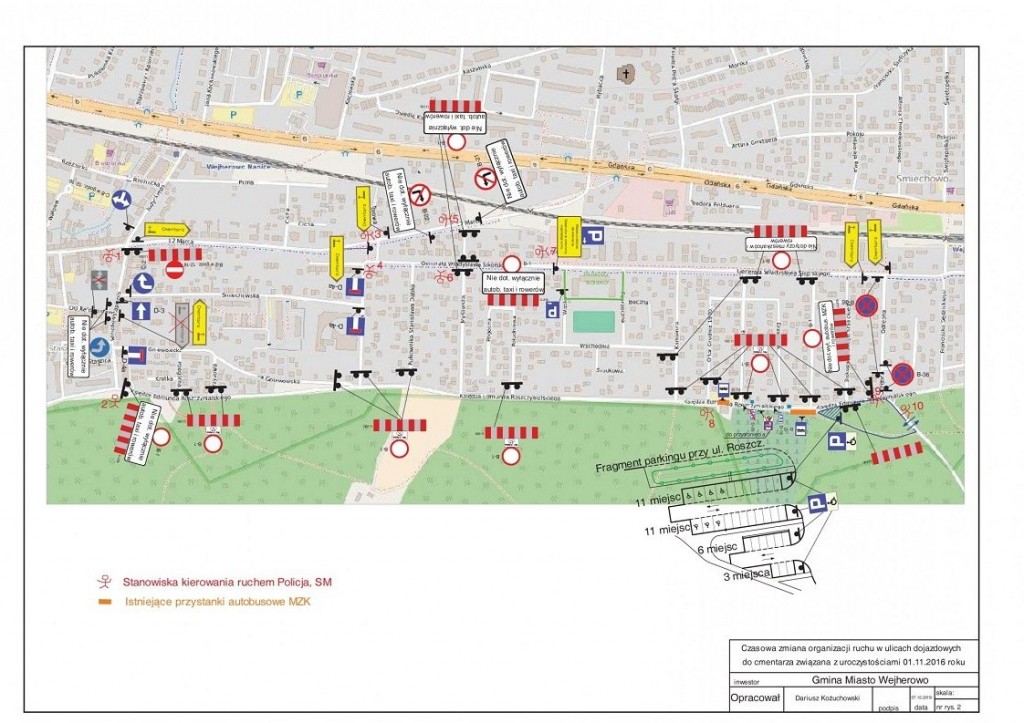W dniu 1 listopada zmiany w organizacji ruchu będą obejmowały głównie dzielnicę Śmiechowo południe ograniczoną ulicami Wniebowstąpienia od zachodu, 12 Marca i Sikorskiego od północy i Odrębną od wschodu i Roszczynialskiego od południa. Główne dojazdy komunikacji zbiorowej do cmentarza ulicami Roszczynialskiego i Myśliwską. Na ul. Roszczynialskiego od ul. Wniebowstapienia do ul. Odrębnej poruszać się mogą jedynie autobusy komunikacji zbiorowej, taxi, rowery. Nie można dopuścić do wjazdu, zatrzymywania, postoju, manewrów zawracania innym uczestnikom ruchu. Wszystkie dojazdy do ul. Roszczynialskiego w obrębie cmentarza zostaną zamknięte.