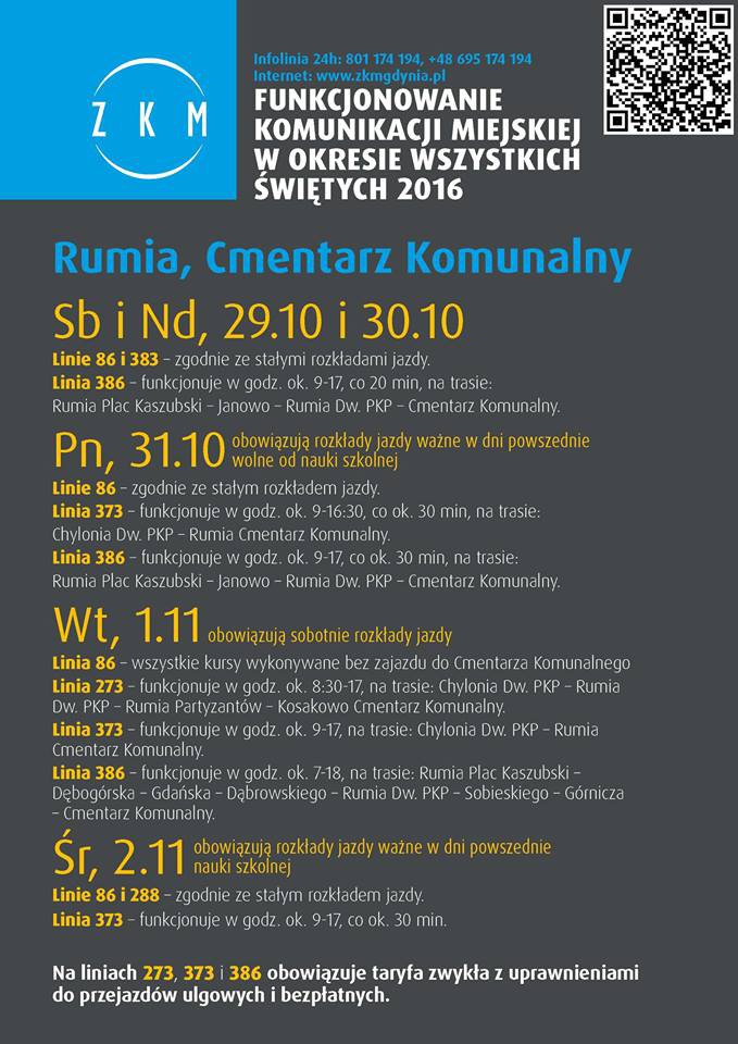 1 listopada komunikacja będzie kursowała zgodnie z rozkładami jazdy obowiązującymi w niedziele i dni świąteczne oraz uruchomione zostaną do wejherowskiego Cmentarza przy ul. Roszczynialskiego od godz. 8 dodatkowe linie: "A" Wejherowo Dworzec PKP - Cmentarz; "C" Os. Kaszubskie - Cmentarz; linia "D" Przemysłowa-Cmentarz.