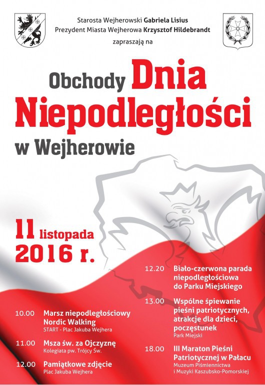 Burmistrz Władysławowa Roman Kużel zaprasza na obchody Narodowego Święta Niepodległości, jakie odbędą się w dniu 11 listopada 2016 roku we Władysławowie.