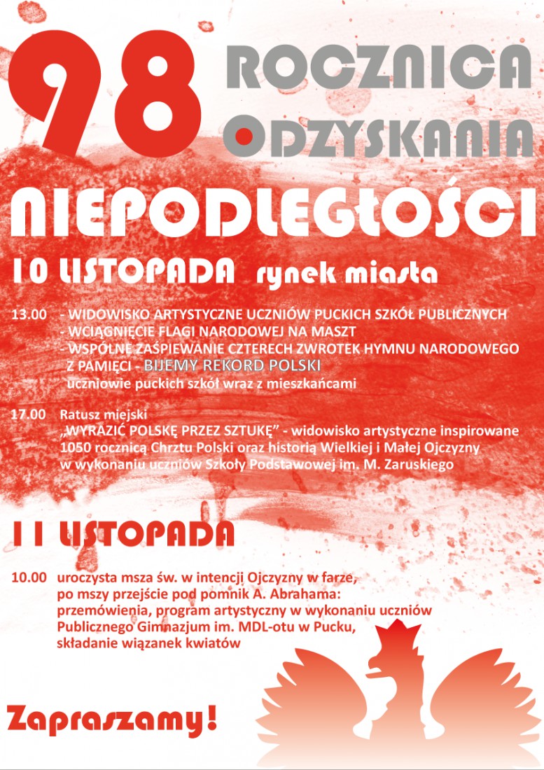 10.00 uroczysta msza św. w intencji Ojczyzny w farze, po mszy przejście pod pomnik A. Abrahama: przemówienia, program artystyczny w wykonaniu uczniów Publicznego Gimnazjum im. MDL-otu w Pucku, składanie wiązanek kwiatów